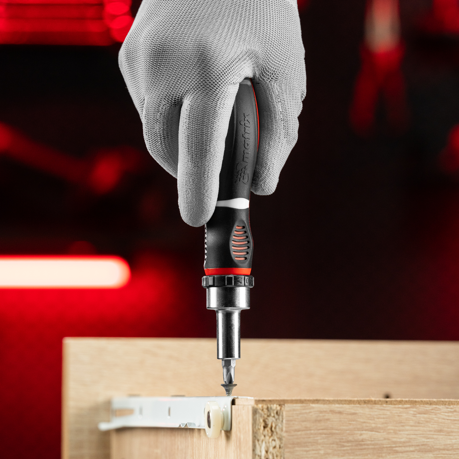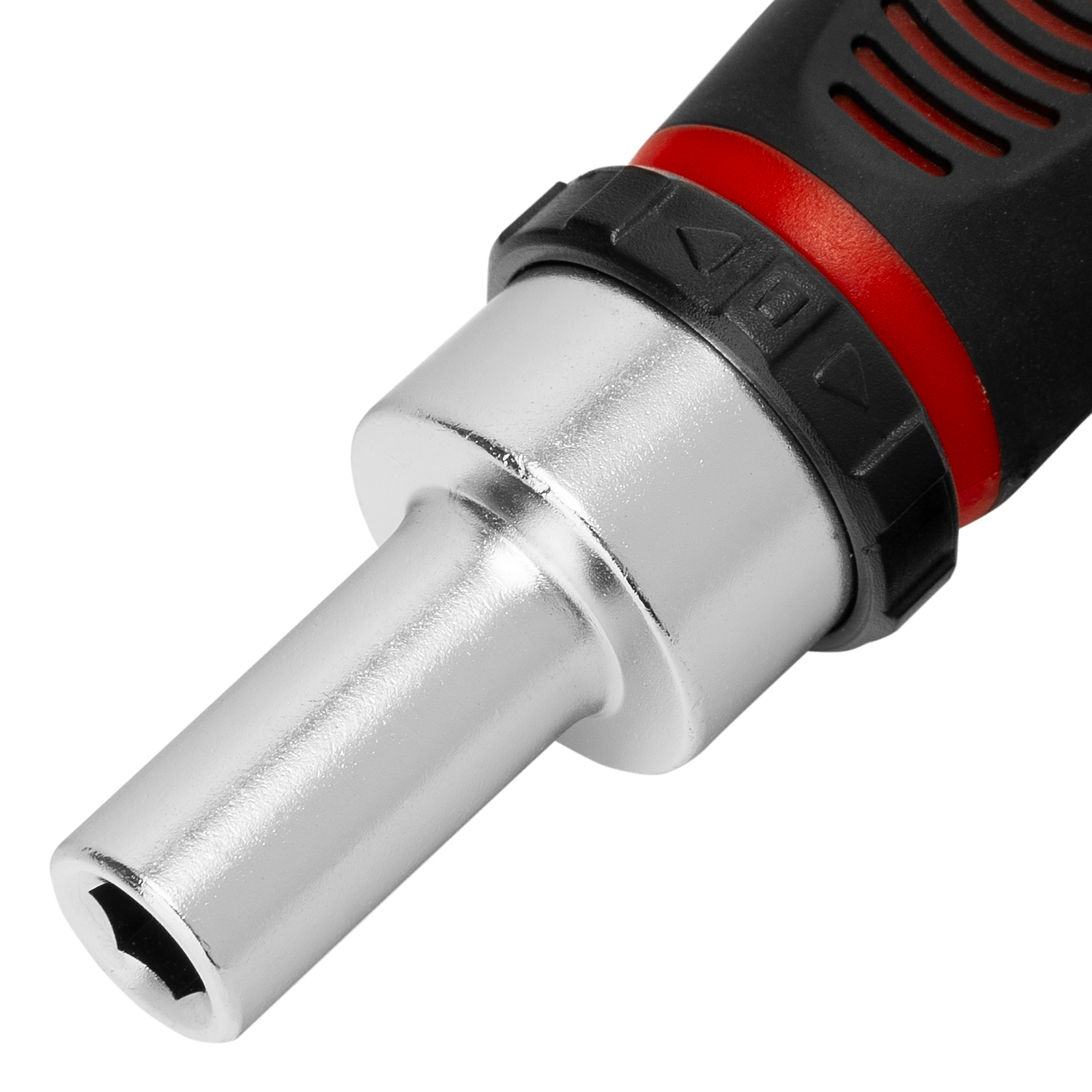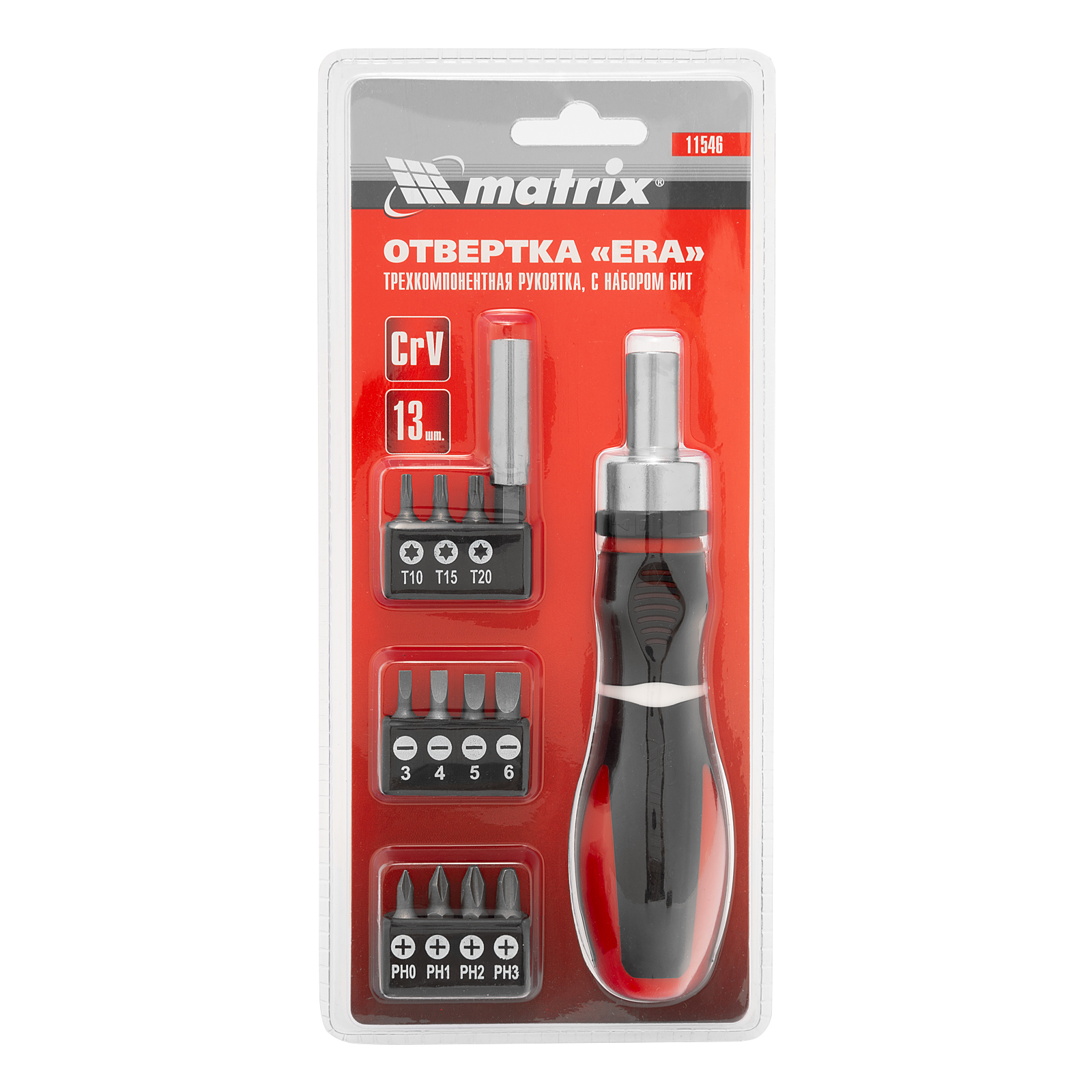 Реверсивная отвертка Matrix 11546 с набором бит из 11 шт., изготовленных из стали CrV, используется для монтажа и демонтажа резьбовых соединений. Храповой механизм ускоряет закручивание и откручивание крепежа, поскольку позволяет не тратить время и силы на перехватывание ручки. Поворотное кольцо для переключения реверса обеспечивает возможность вращения в противоположном направлении. В комплект поставки входят биты самых распространенных размеров со шлицами PH, SL и Torx. Отвертка будет полезна во время сборки мебели, ремонта электроприборов, велосипедов, мотоциклов и автомобилей.