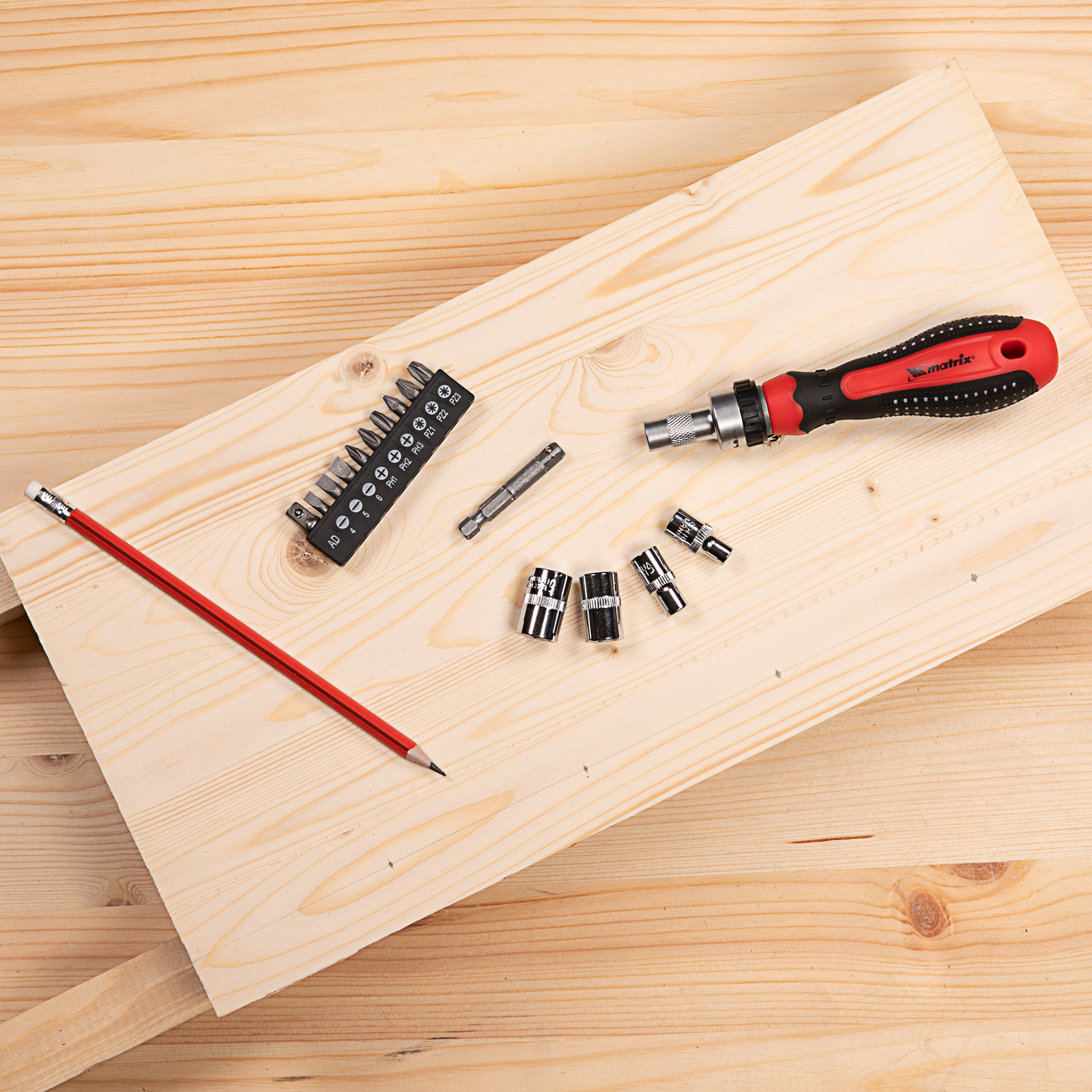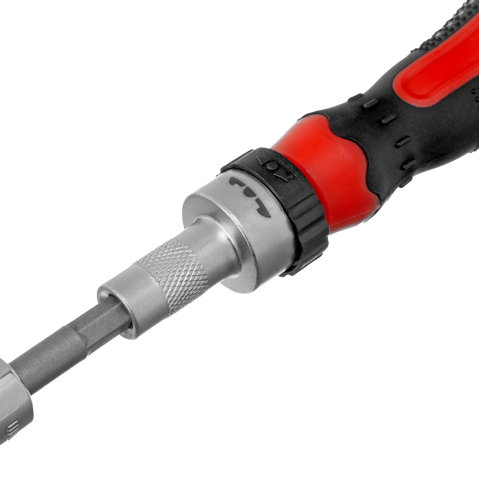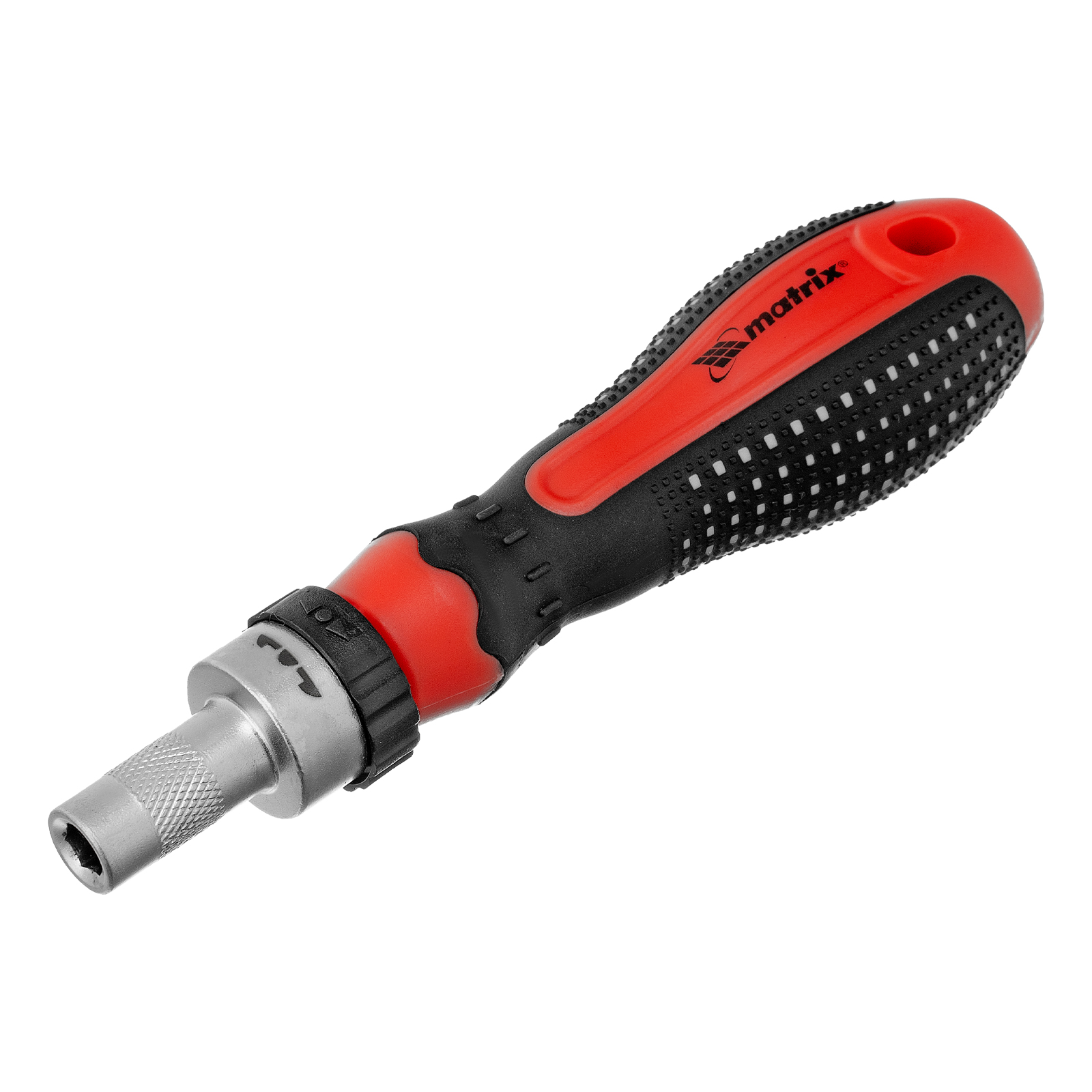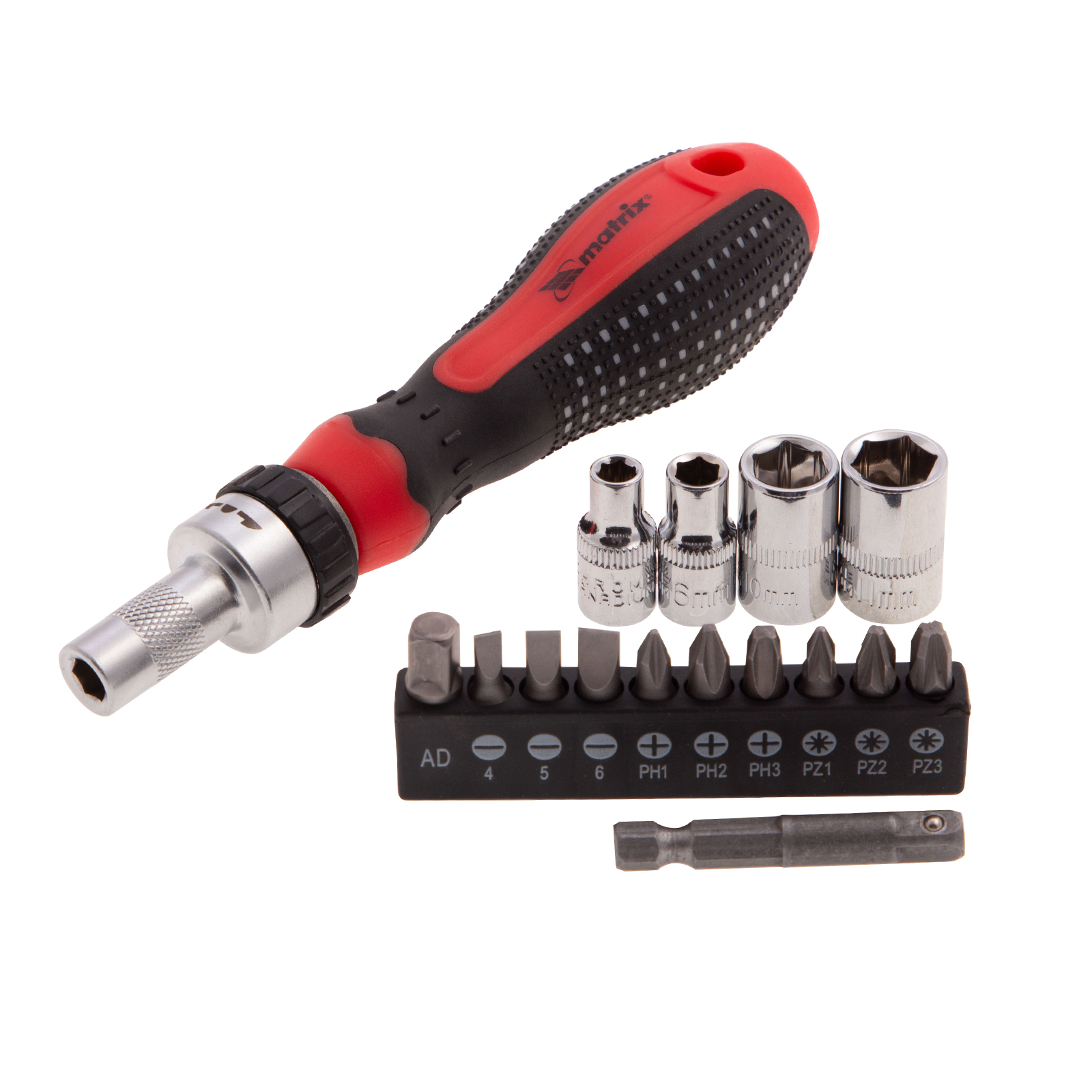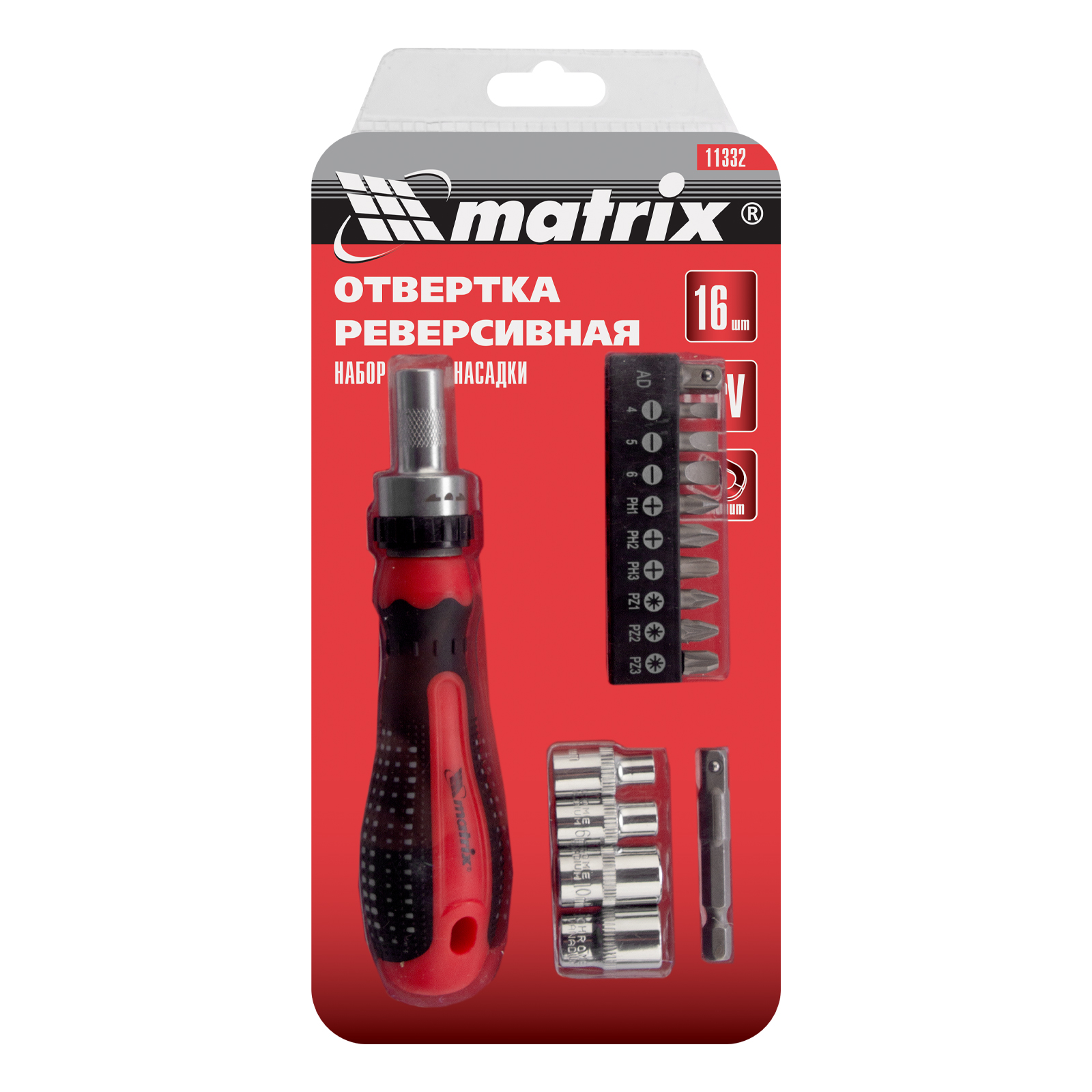 Реверсивная отвертка Matrix 11332 с набором бит и торцевых насадок из стали CrV, с присоединительным размером 1/4", 16 шт. в упаковке, предназначена для работ с резьбовыми соединениями. Благодаря торцевым головкам с адаптером может использоваться в качестве накидного ключа. Храповой механизм облегчает вращение отвертки и увеличивает скорость работы. Направление вращения можно менять при помощи кольцевого переключателя. Отвертка пригодится при сборке и установке мебели, ремонте бытовой техники, будет полезна дома, на даче или в гараже.