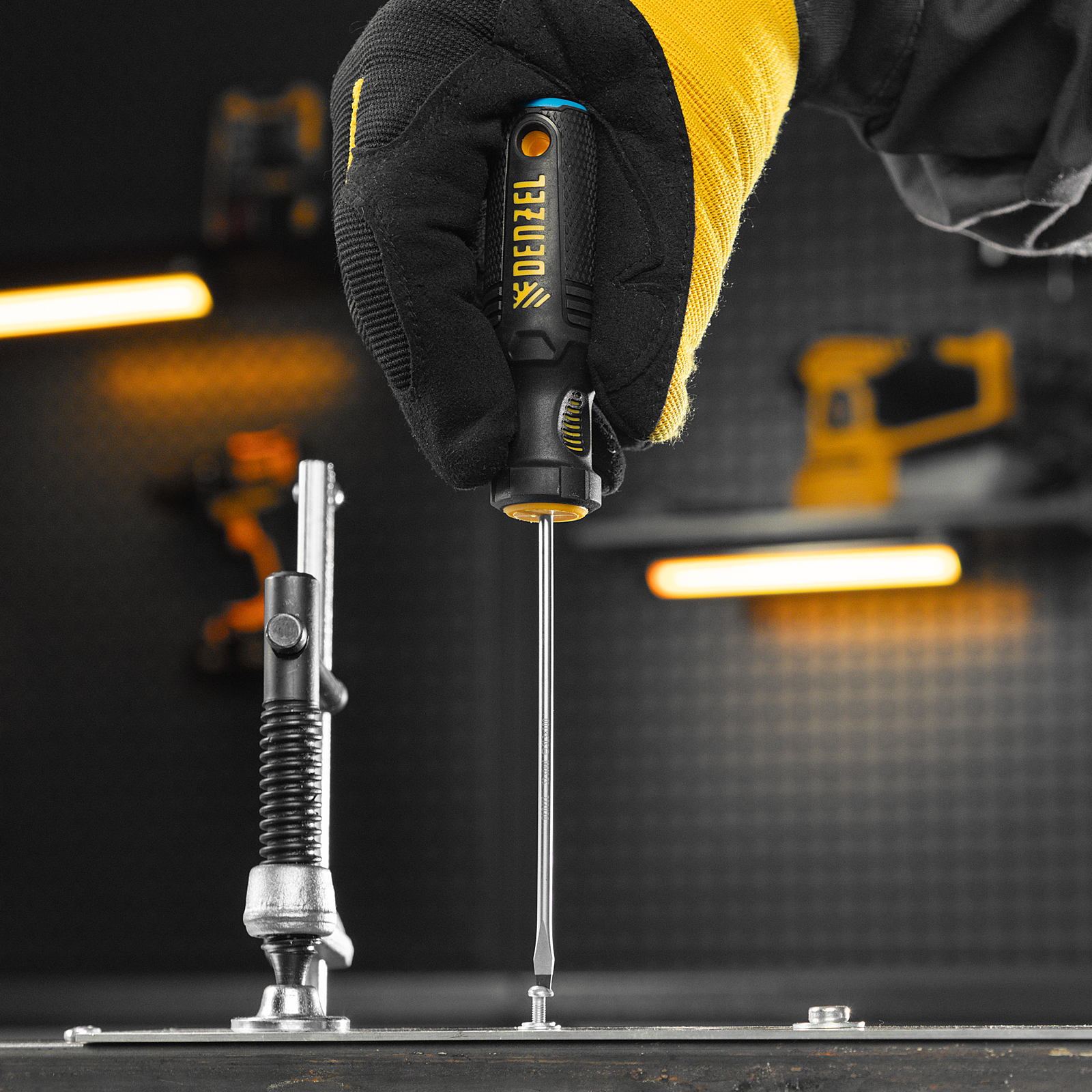 Отвертка Denzel 121907 с трехкомпонентной рукояткой, со стержнем из стали S2, длиной 100 мм, предназначена для монтажа и демонтажа винтов и саморезов с прямым шлицем SL3. Высокоточный намагниченный шлиц крепко фиксируется в головке крепежа. Отвертка выдерживает интенсивное применение, предназначена для выполнения профессиональных ремонтных и монтажных работ.