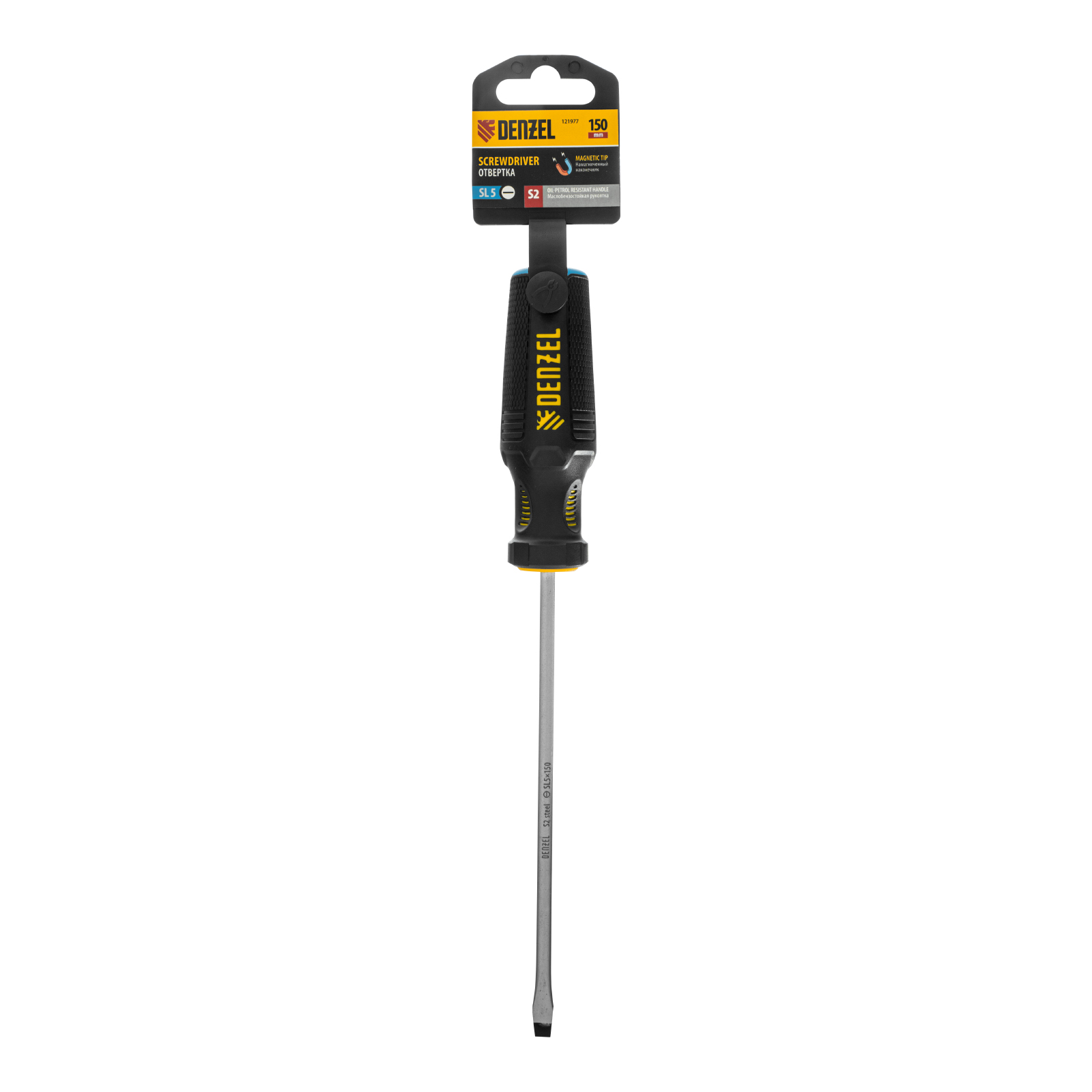Отвертка Denzel 121977 с трехкомпонентной рукояткой, со стержнем из стали S2, длиной 150 мм, предназначена для монтажа и демонтажа винтов и саморезов с прямым шлицем SL5. Высокоточный намагниченный шлиц крепко фиксируется в головке крепежа. Отвертка выдерживает интенсивное применение, предназначена для выполнения профессиональных ремонтных и монтажных работ.