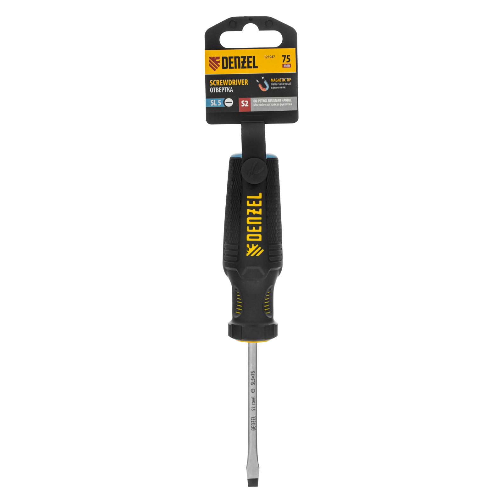 Отвертка Denzel 121947 с трехкомпонентной рукояткой, со стержнем из стали S5, длиной 75 мм, предназначена для монтажа и демонтажа винтов и саморезов с прямым шлицем SL5. Высокоточный намагниченный шлиц крепко фиксируется в головке крепежа. Отвертка выдерживает интенсивное применение, предназначена для выполнения профессиональных ремонтных и монтажных работ.