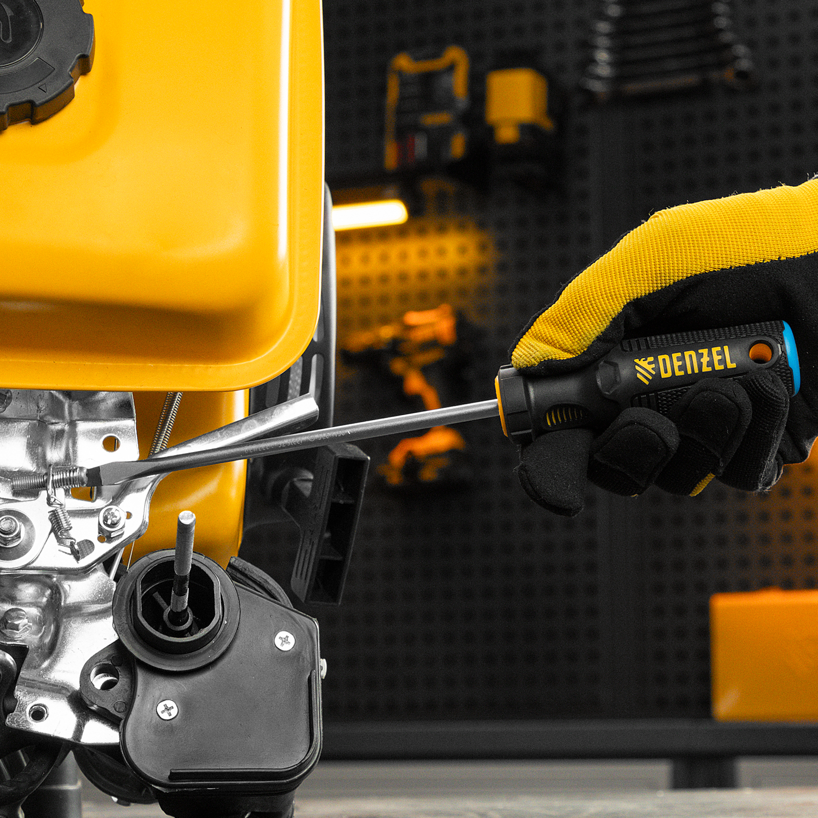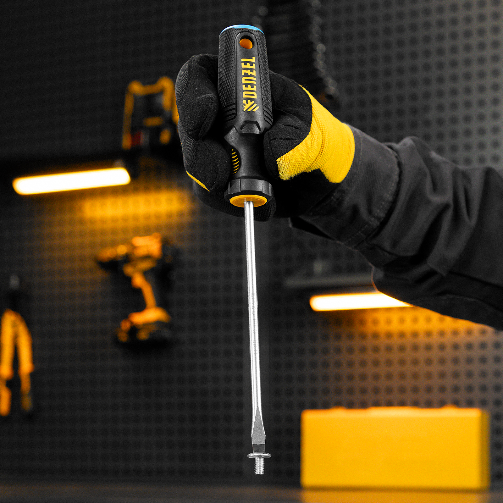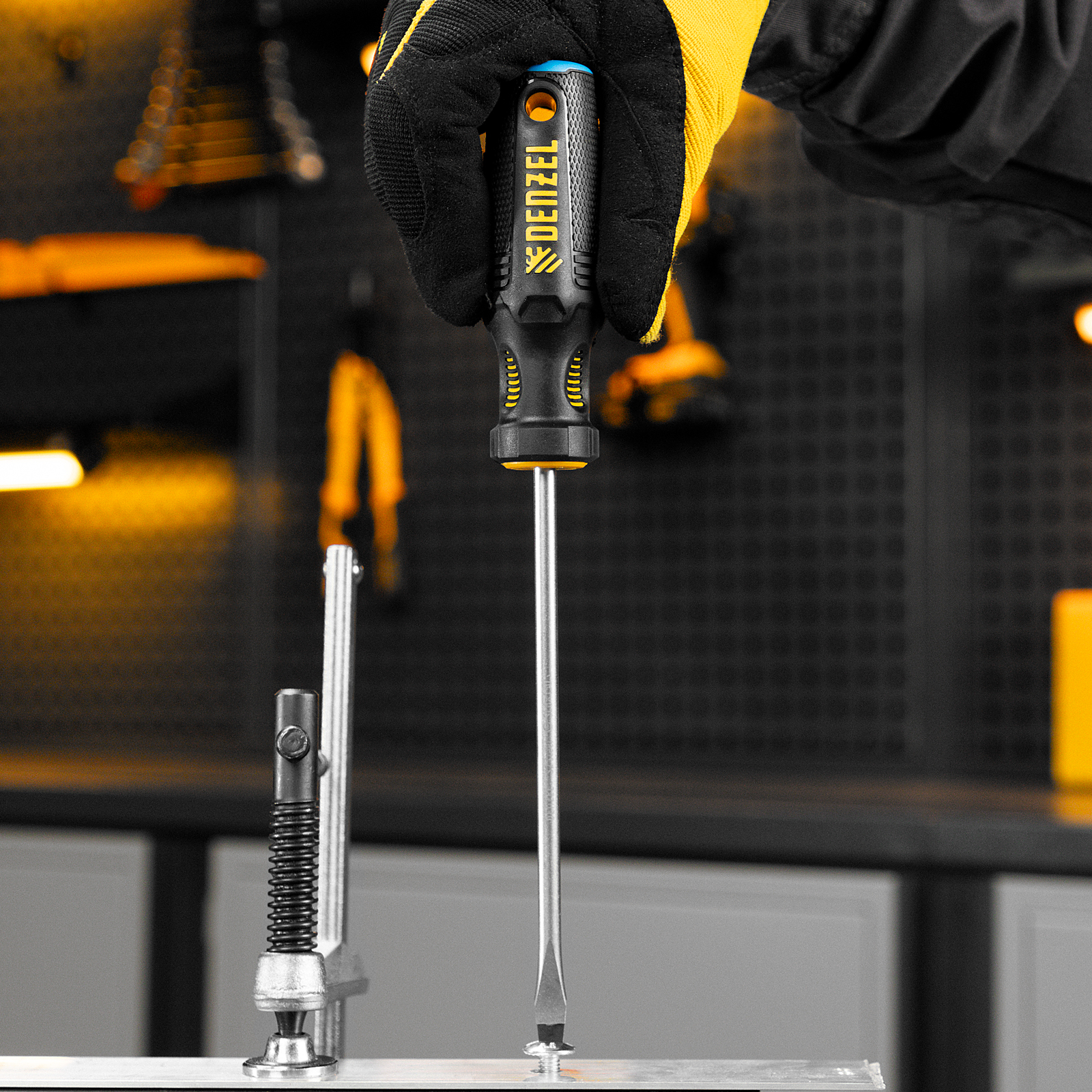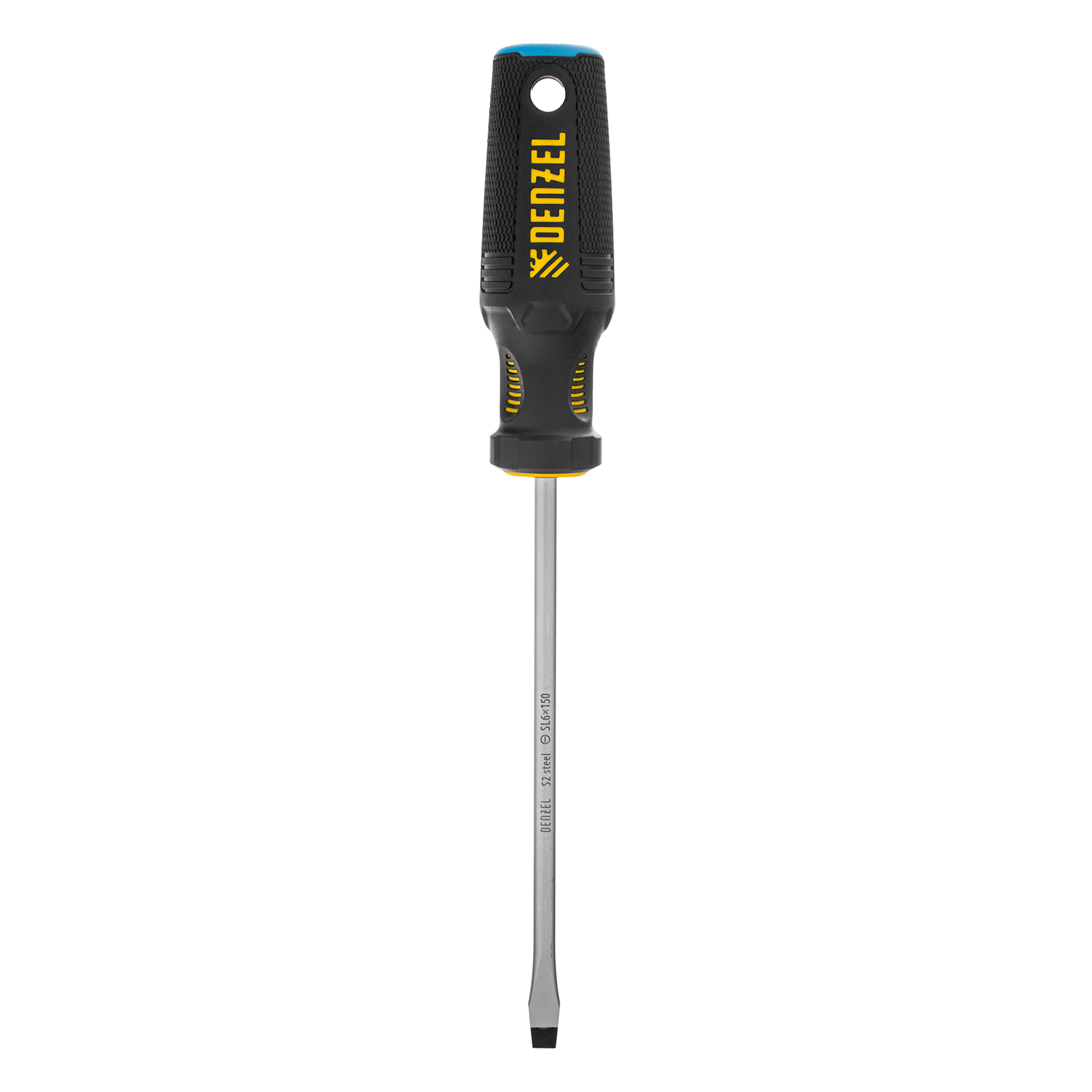 Отвертка Denzel 121997 с трехкомпонентной рукояткой, со стержнем из стали S2, длиной 150 мм, предназначена для монтажа и демонтажа винтов и саморезов с прямым шлицем SL6. Высокоточный намагниченный шлиц крепко фиксируется в головке крепежа. Отвертка выдерживает интенсивное применение, предназначена для выполнения профессиональных ремонтных и монтажных работ.