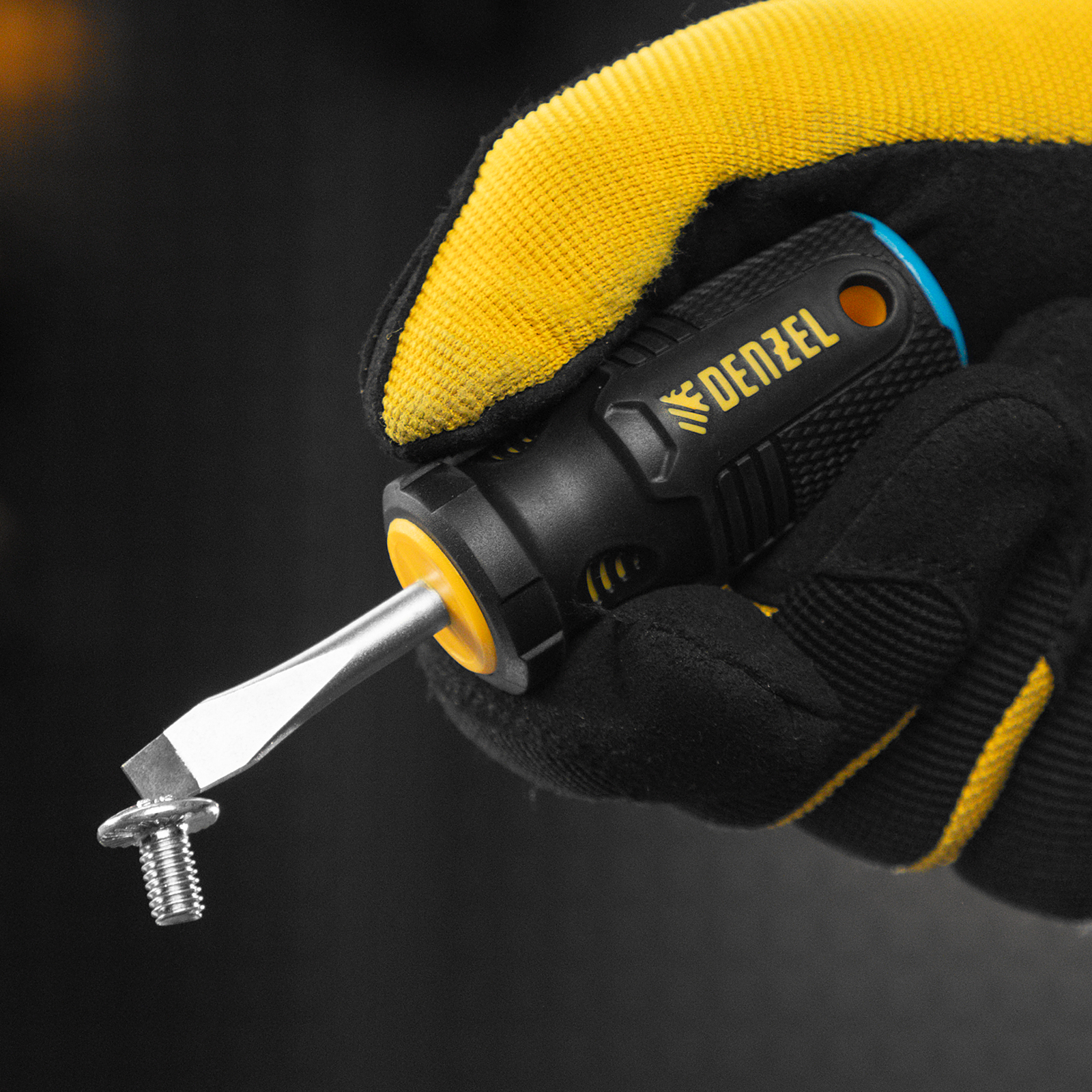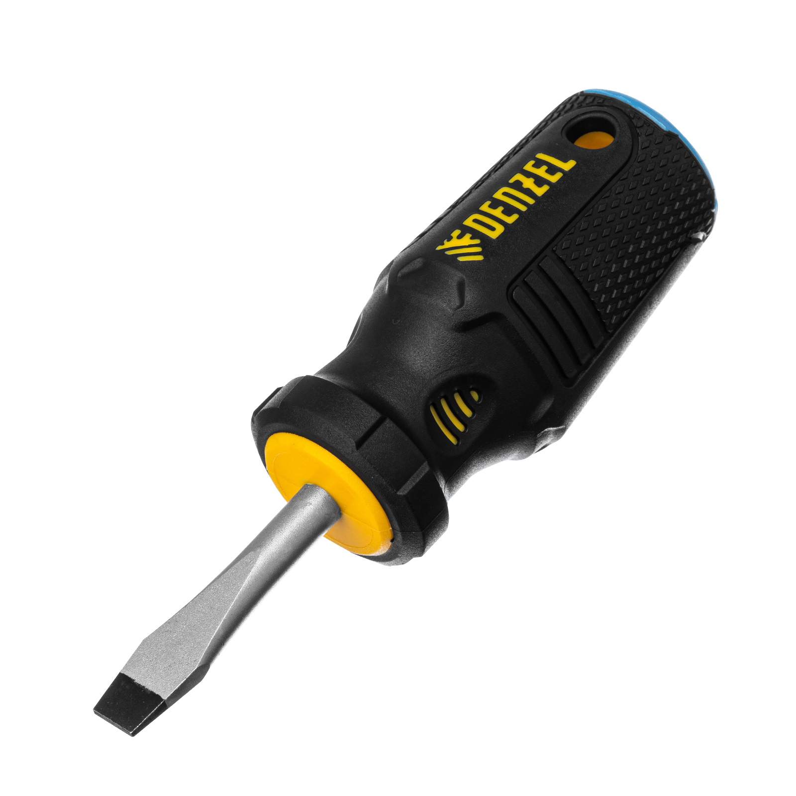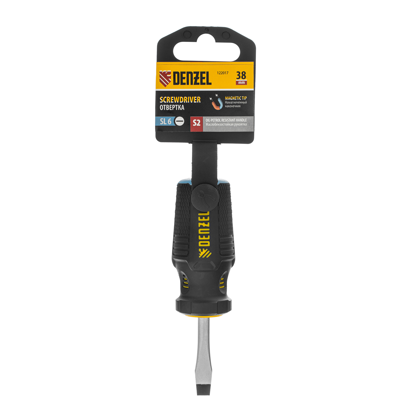 Отвертка Denzel 122017 с трехкомпонентной рукояткой, со стержнем из стали S2, длиной 38 мм, предназначена для монтажа и демонтажа винтов и саморезов с прямым шлицем SL6. Удобна для работы в ограниченном пространстве. Высокоточный намагниченный шлиц крепко фиксируется в головке крепежа. Отвертка выдерживает интенсивное применение, предназначена для выполнения профессиональных ремонтных и монтажных работ.