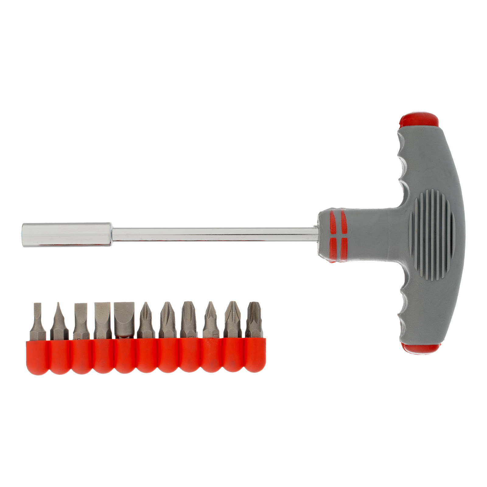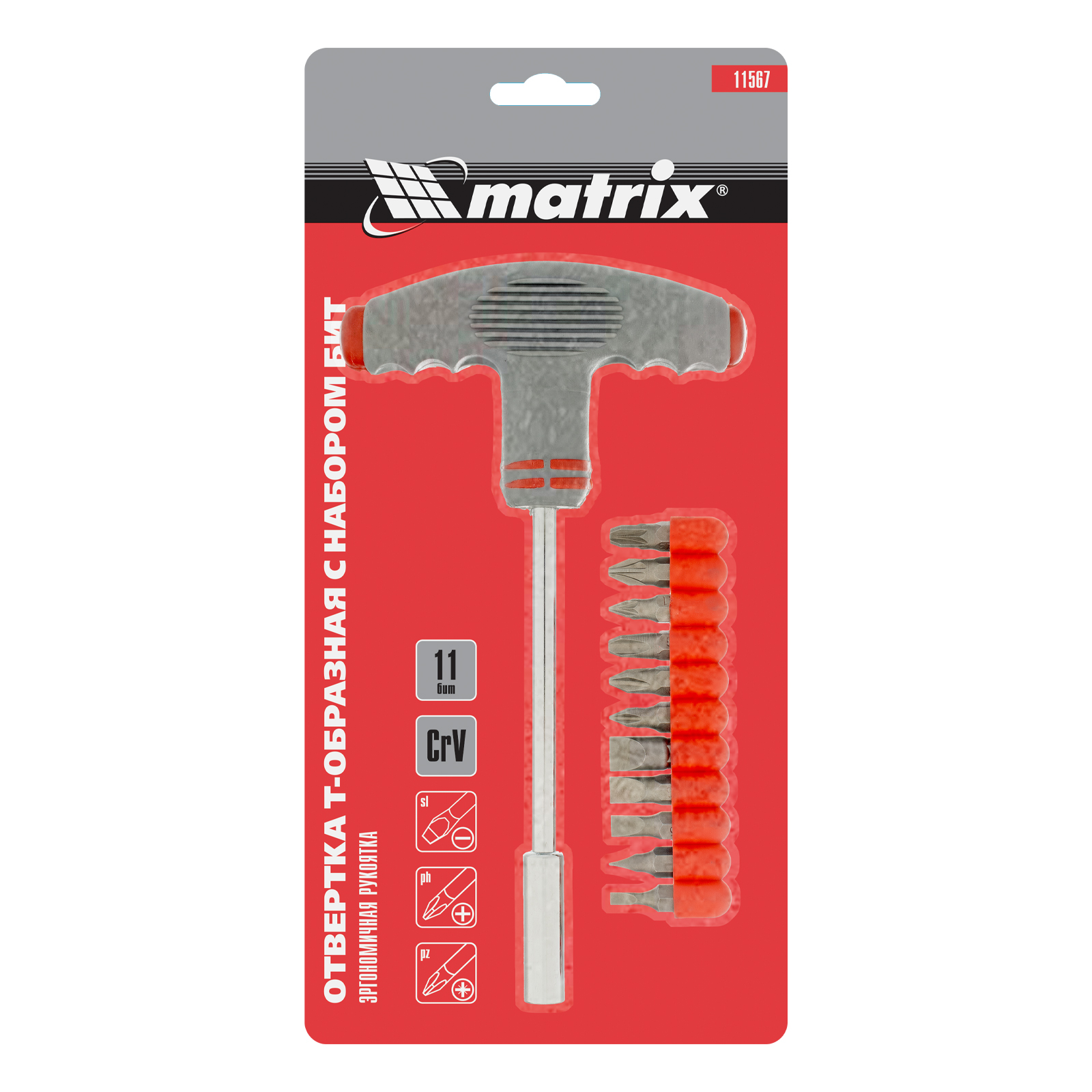 Отвертка Matrix 11567 с Т-образной эргономичной ручкой и набором бит из 11 шт., из стали CrV, — это держатель с присоединительным шестигранником, в котором фиксируется бита необходимого типоразмера. Отвертка служит для закручивания и откручивания резьбового крепежа. В комплект поставки входят биты самых востребованных размеров со шлицами PH, PZ и SL. Т-образная рукоятка экономит усилия при передаче повышенного крутящего момента. Набор рекомендован для бытового применения.