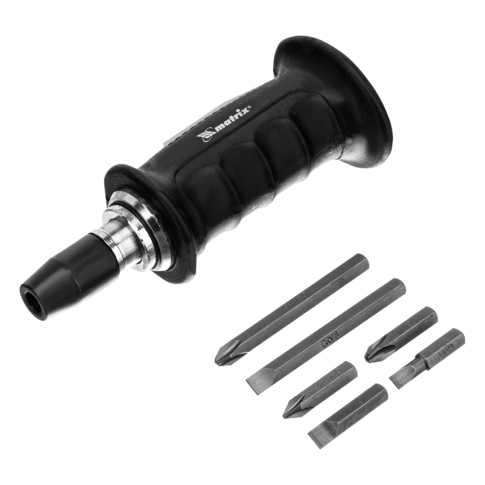 Ударно-поворотная отвертка Matrix 11561 с черной ручкой, с присоединительным шестигранником 1/2", с набором из 6 бит., в пластиковом кейсе, предназначена для работы с резьбовыми соединениями, в том числе для демонтажа перетянутых или заржавевших крепежей. Металлический затыльник выдерживает удары молотком. Отвертка используется при проведении ремонта автомобильной и другой техники, рекомендована для профессионального применения.
