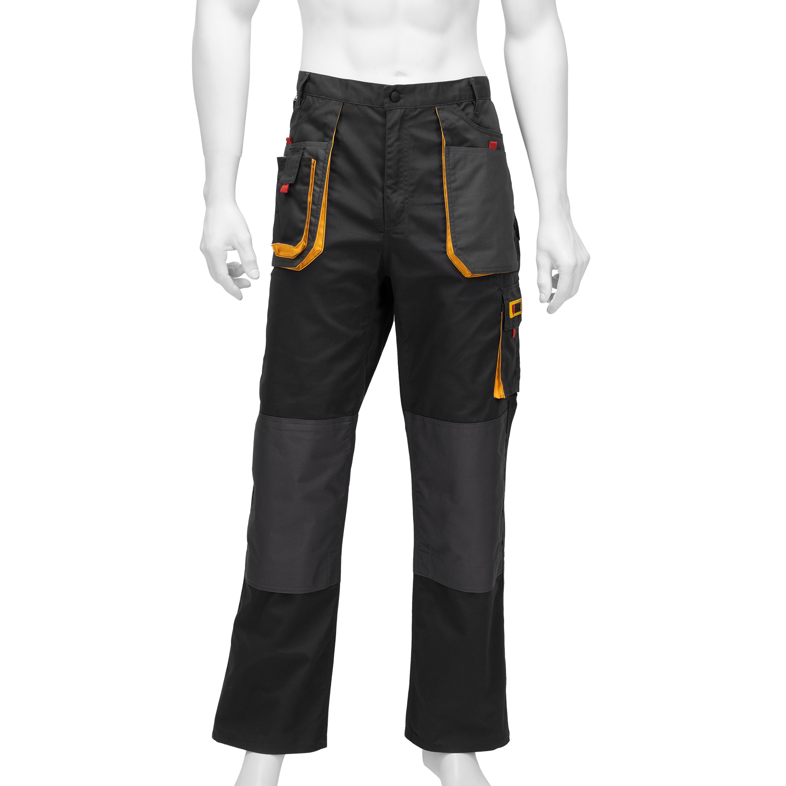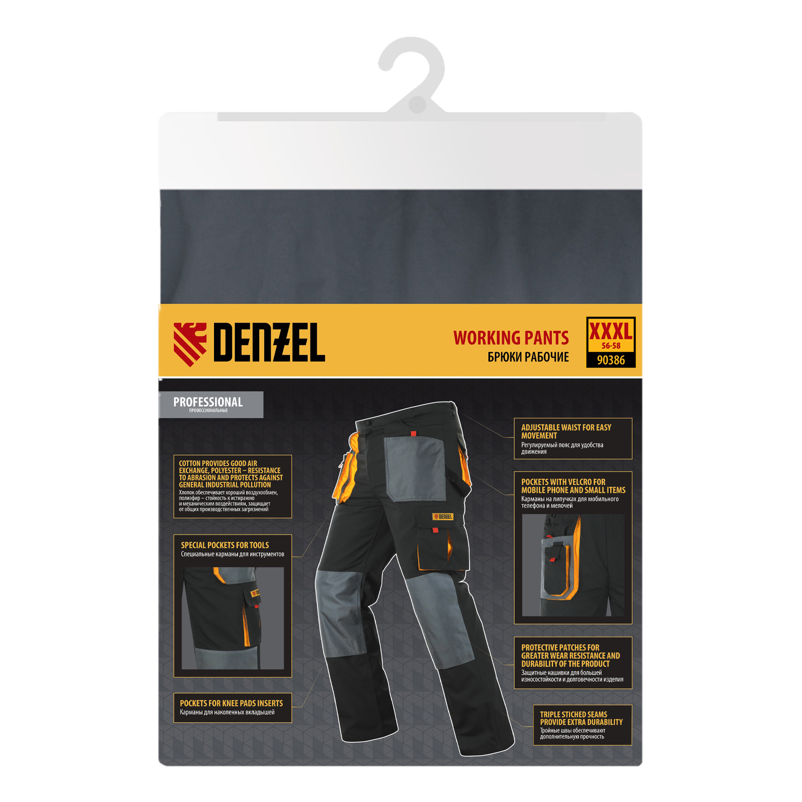 Рабочие брюки Denzel 90386 размера XXXL рассчитаны на рост 188-191 см и используются для выполнения профессиональных строительных, ремонтных, сантехнических и производственных работ в теплое время года или в отапливаемом помещении. Защищают пользователя от общих производственных загрязнений, нетоксичной пыли, ветра и незначительных механических воздействий. Изготовлены из ткани плотностью 260 г/м² (65% полиэстер, 35% хлопок). За счет наличия хлопковых волокон в составе ткань хорошо пропускает воздух и приятна на теле, полиэстер обеспечивает устойчивость к истиранию. Брюки выполнены в практичном темно-сером цвете.