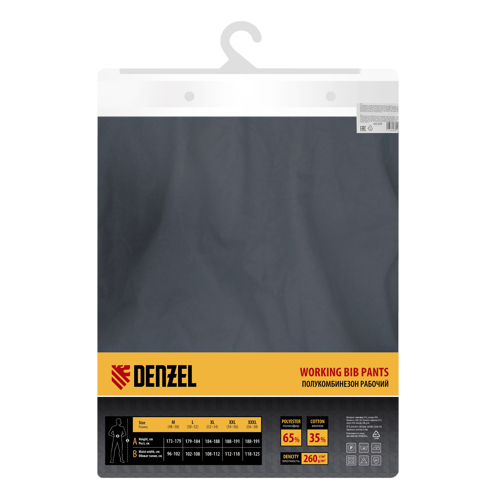Рабочий полукомбинезон Denzel 90391 размера XXXL рассчитан на рост 188-191 см и используется для выполнения профессиональных строительных, ремонтных и производственных работ в теплое время года или в отапливаемом помещении. Защищает пользователя от общих производственных загрязнений, нетоксичной пыли, ветра и незначительных механических воздействий. Изготовлен из ткани плотностью 260 г/м² (65% полиэфир, 35% хлопок). За счет наличия хлопковых волокон в составе ткань хорошо пропускает воздух и приятна на теле, полиэфир обеспечивает устойчивость к истиранию. Полукомбинезон выполнен в практичном темно-сером цвете.