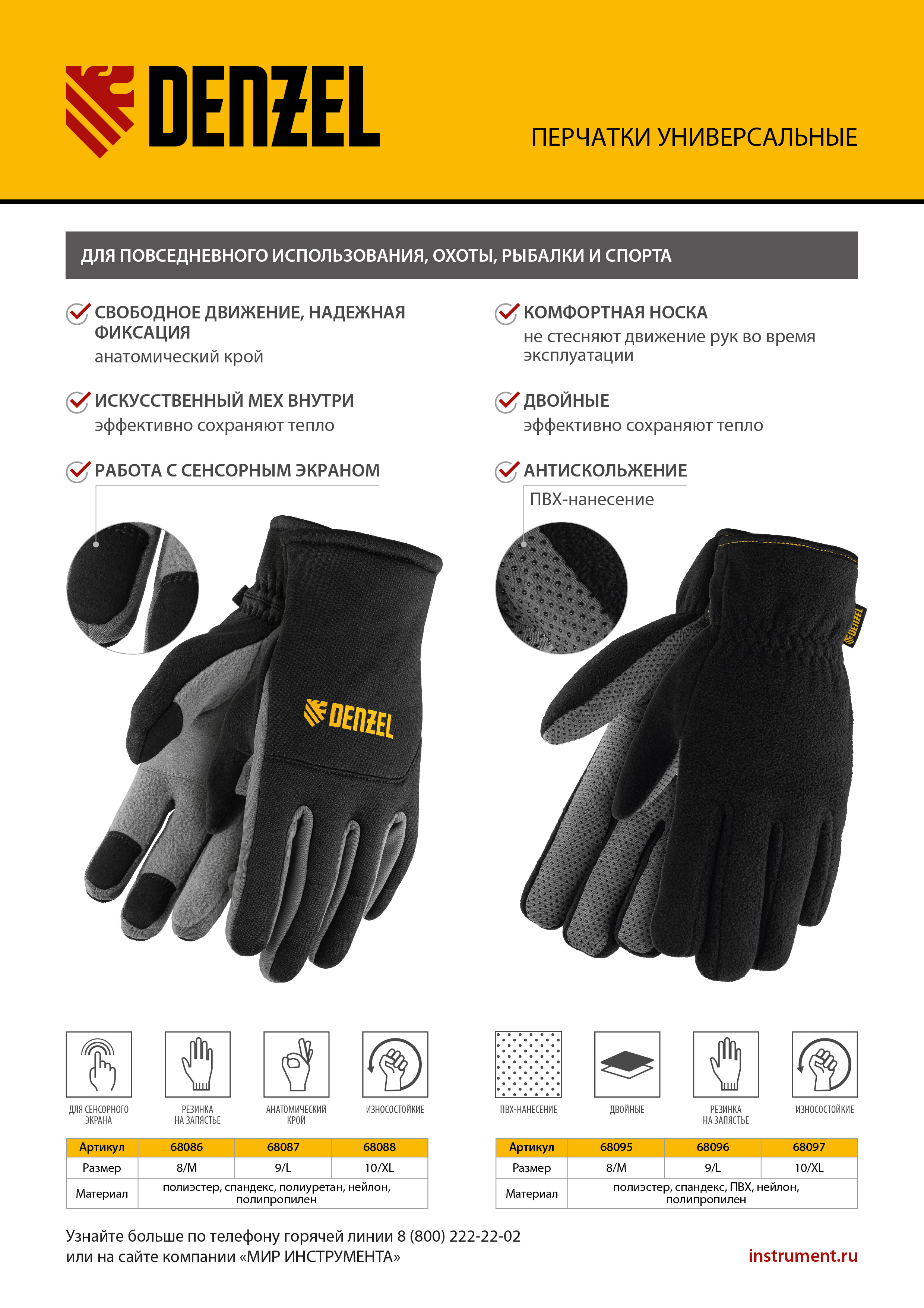 Универсальные перчатки Denzel 68096 размера 9, c ПВХ-нанесением, предназначены для повседневного использования. Также пригодятся во время охоты, рыбалки и занятий спортом.