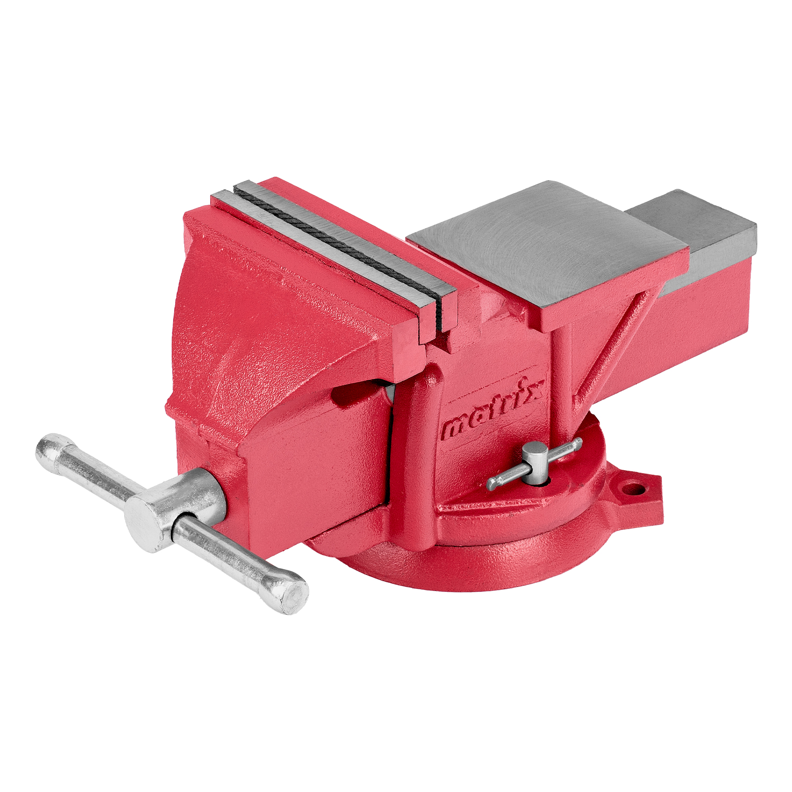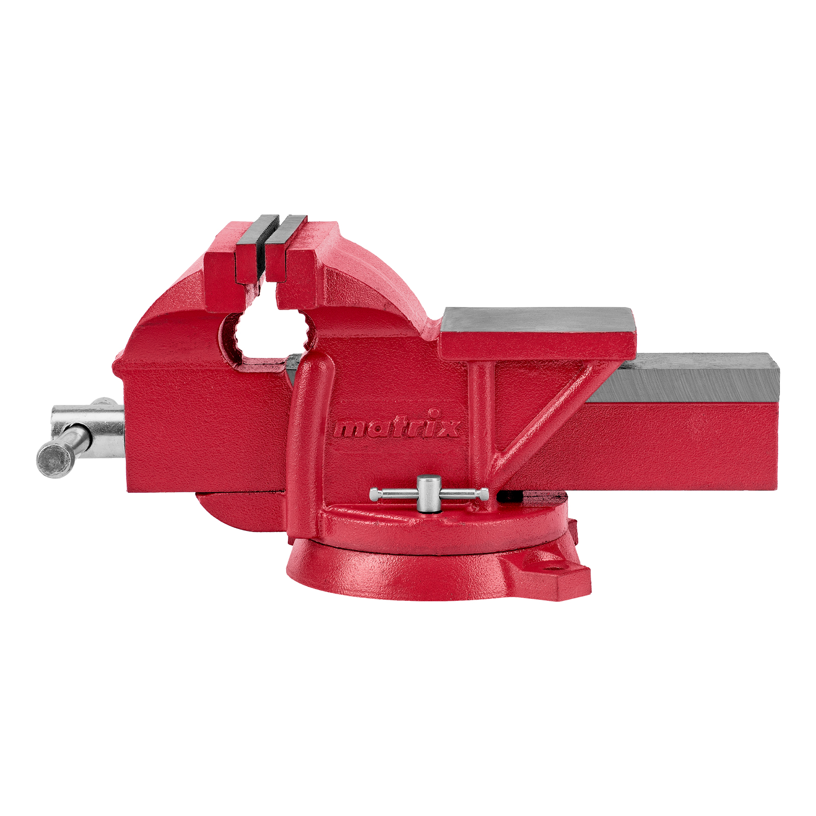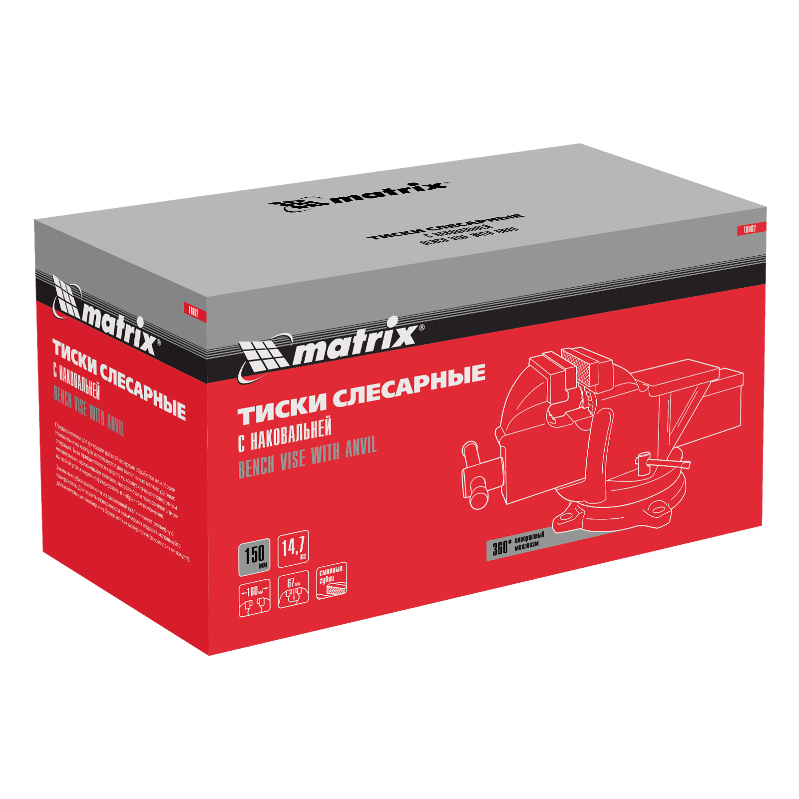 Поворотные слесарные тиски Matrix 18602 с наковальней и губками шириной 150 мм имеют рабочий ход 160 мм и предназначены для захвата и фиксации различных деталей. Поворотный механизм с прижимными винтами позволяет вращать тиски на 360° и фиксировать их в выбранном положении для удобной обработки заготовок с разных сторон. Инструмент используется для шлифовки, сверления и проведения других работ. Будет полезен в мастерской и гараже.