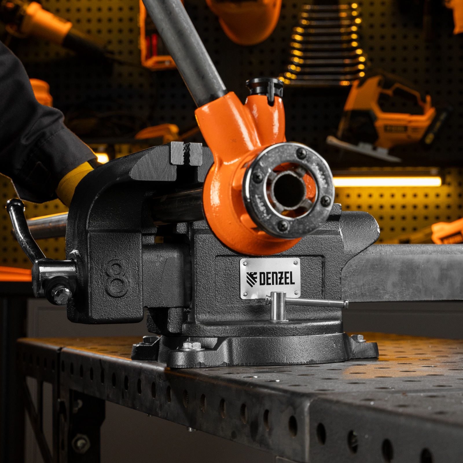Слесарные поворотные тиски Denzel BVH-200 18686 с губками шириной 200 мм и стальной направляющей предназначены для фиксации деталей и заготовок, а также для выполнения мелких ударных работ — в конструкции предусмотрена наковальня. Рабочий ход составляет 200 мм, глубина зажима — 90 мм. Специальный зажим позволяет фиксировать трубы диаметром 25-64 мм, что расширяет возможности использования инструмента. На губки можно установить защитные накладки (приобретаются отдельно) для предотвращения повреждения зажимаемых предметов. Тиски пригодятся в мастерской и гараже.