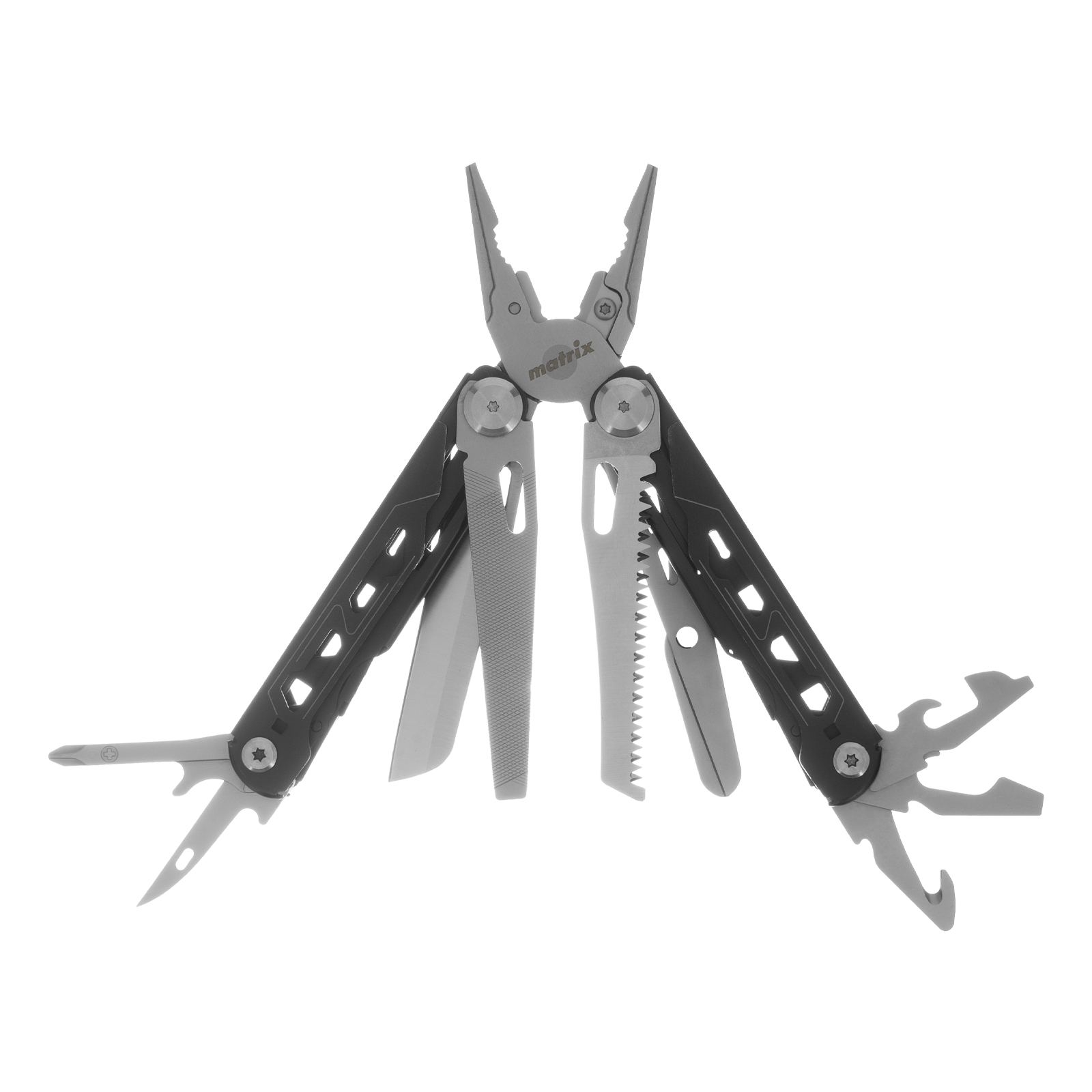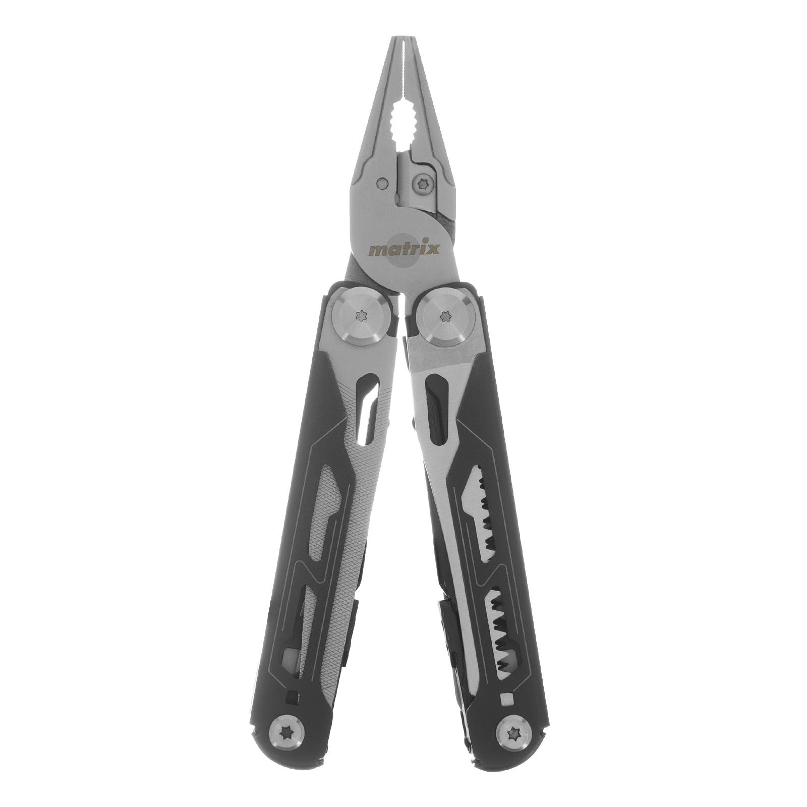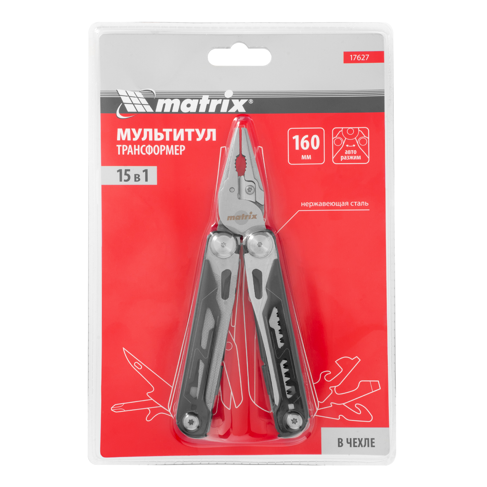 Трансформер (мультитул) Matrix 17627 длиной 160 мм, с авторазжимом, способен выполнять 15 функций. Подходит для выполнения несложных слесарно-монтажных работ, будет полезен дома, на даче, в походе, на рыбалке, также пригодится автолюбителям. Корпус изготовлен из прочной нержавеющей стали, поэтому инструмент прослужит долго.