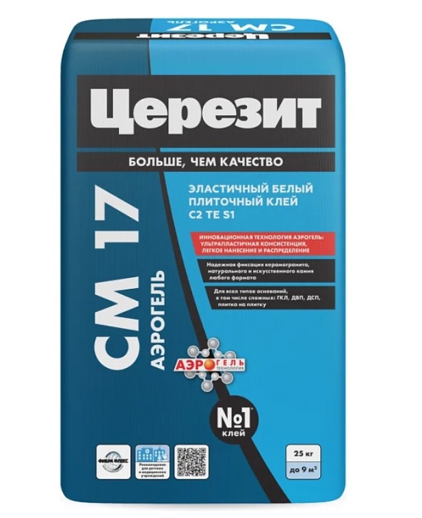Плиточный белый эластичный клей для крупноформатного керамогранита Церезит Аэрогель CM17 25 кг имеет класс С2ТЕS1.